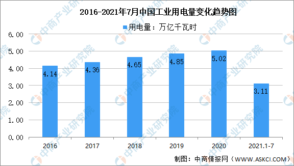 數(shù)據(jù)顯示,2021年1-7月,工業(yè)用電量達(dá)3.11萬億千瓦時。第一產(chǎn)業(yè)用電量102億千瓦時,同比增長20.0%;第二產(chǎn)業(yè)用電量5068億千瓦時,同比增長9.3%;第三產(chǎn)業(yè)用電量1422億千瓦時,同比增長21.6%;其中,7月工業(yè)用電量達(dá)4972億千瓦時。