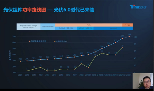 根據(jù)光伏組件功率路線圖顯示,光伏6.0時(shí)代已來臨。天合光能主要是在210mm 硅片、無損切割技術(shù)、低電壓設(shè)計(jì)、高密度封裝、多分片設(shè)計(jì)、MBB等幾大方面進(jìn)行創(chuàng)新。