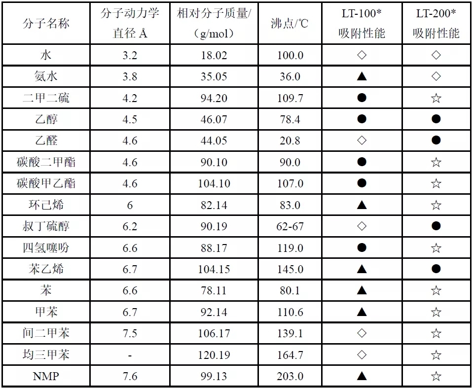參照《分子篩靜態(tài)水吸附測定方法》(GB/T 6287—1986)分子篩靜態(tài)水吸附測定方法;◇表示<5 wt % ;▲表示(5~10) wt % ;●表示(10~20 )wt %;☆表示(20~30) wt %。