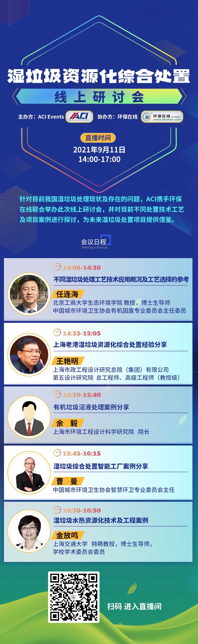 針對目前我國濕垃圾處理現(xiàn)狀及存在的問題,ACI攜手環(huán)保在線聯(lián)合舉辦濕垃圾資源化綜合處置線上研討會,針對目前不同處置技術(shù)工藝及項目案例進行深入探討,為未來濕垃圾處置項目提供借鑒。此次會議由ACI Events主辦,環(huán)保在線協(xié)辦,會議時間為2021年9月11日14:00-17:00。