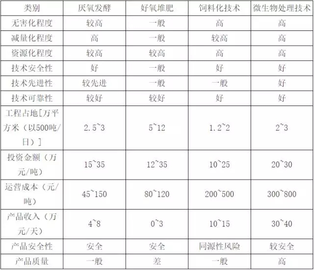 2)從經(jīng)濟(jì)效益比較,我們以日處理規(guī)模為500t計(jì)算,盡管資源化處理的費(fèi)用最高,但其總收益也最大,綜合來看年均收益能達(dá)到 1435 萬元。資源化處理方式又細(xì)分為厭氧發(fā)酵、好氧堆肥、直接烘干做飼料和微生物處理等。