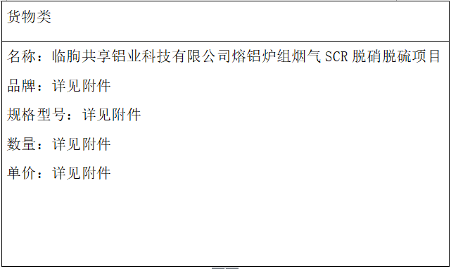原標(biāo)題:臨朐共享鋁業(yè)科技有限公司熔鋁爐組煙氣SCR脫硝脫硫項(xiàng)目中標(biāo)公告