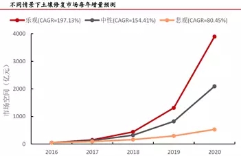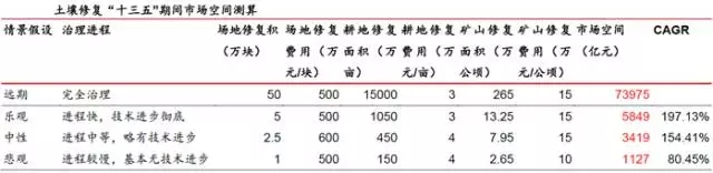 土壤修復(fù)十三五市場空間1100億-5900億,遠(yuǎn)期市場總量在7.4萬億元左右。在中性情景下,十三五市場空間總量約3400億。