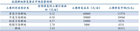 土壤問題具有隱蔽性,輿論媒體關(guān)注低。與大氣污染和水污染不同,土壤污染的表現(xiàn)形式相對隱蔽。部分土壤污染物從肉眼上并不容易辨別,而部分受污染的土壤又遠(yuǎn)離人們的聚居區(qū),因此導(dǎo)致土壤污染相對難以得到重視。土壤市場仍未完全釋放,但潛在市場巨大,預(yù)計(jì)十三五期間將引來第一波土壤修復(fù)高潮,市場潛力在3000億左右。