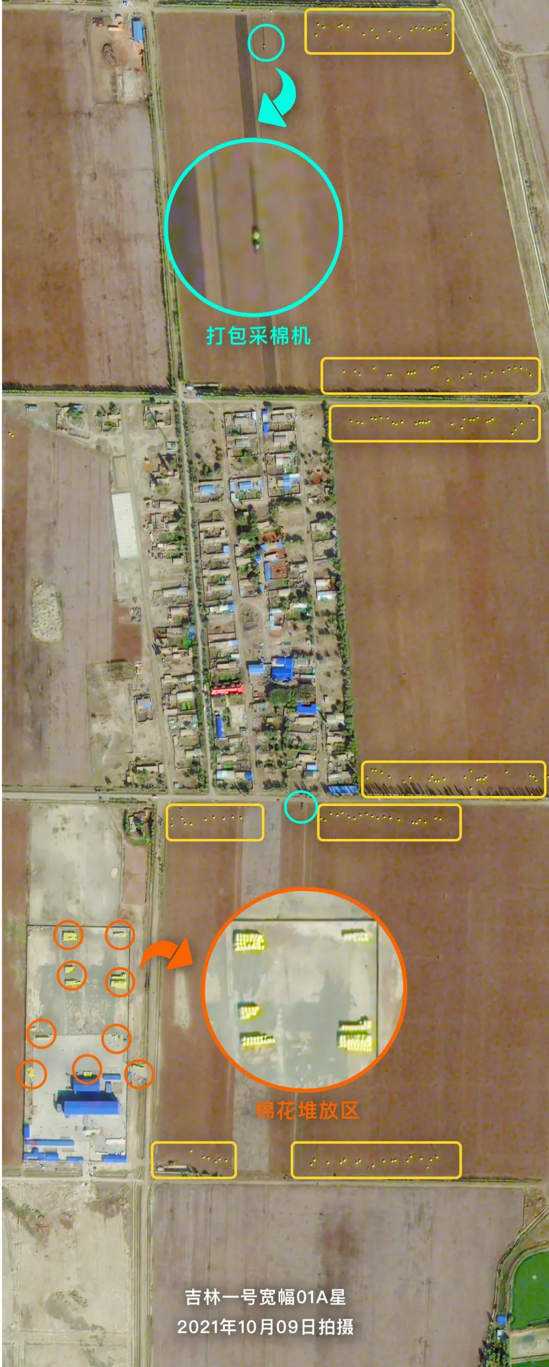 金秋時(shí)節(jié),新疆各地棉花陸續(xù)進(jìn)入采收期。吉林一號(hào)衛(wèi)星從太空記錄下了新疆昌吉回族自治州阜康市機(jī)械化采收棉花的忙碌場(chǎng)景,壓縮打包完成的棉花卷堆積在棉田周圍,正在等待運(yùn)輸。