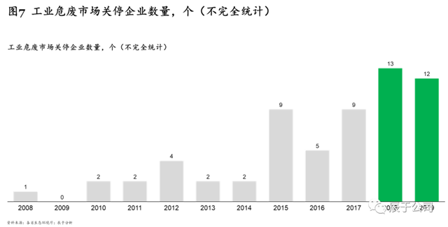 一是與市場需求種類不匹配,根據(jù)2019年最新修訂發(fā)布的《國家危險(xiǎn)廢物名錄》,我國危險(xiǎn)廢物分類共有46大類,471種,而我國90%以上危廢處置企業(yè)僅能處置5種或以下的危廢種類,供需種類錯配的現(xiàn)象較嚴(yán)重;二是產(chǎn)能落后,處置規(guī)模小,技術(shù)和使用設(shè)備落后,無法滿足污染防治的要求;三是安全隱患突出,環(huán)境管理水平低下以及相關(guān)危險(xiǎn)廢物經(jīng)營安全的規(guī)章制度不完善,導(dǎo)致環(huán)境安全隱患問題突出??梢灶A(yù)見的是,隨著市場競爭日益激烈,“小而弱”的工業(yè)危廢企業(yè)將越來越難以適應(yīng)市場新要求,頻頻被“出清”。據(jù)不完全統(tǒng)計(jì),2010-2014年,每年關(guān)停的工業(yè)危廢服務(wù)企業(yè)僅為2——4家,2018和2019年則分別達(dá)到了13和12家(見圖7)。