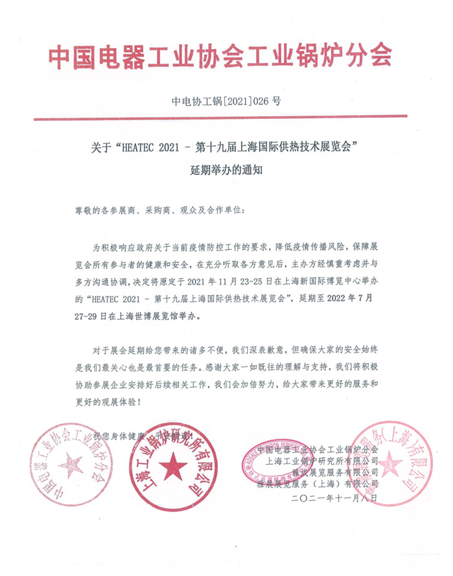 為積極響應政府關于當前疫情防控工作的要求,降低疫情傳播風險,保障展覽會所有參與者的健康和安全,在充分聽取各方意見后,主辦方經慎重考慮并與多方溝通協調,決定將原定于2021年11月23至25日在上海新國際博覽中心舉辦的“HEATEC 2021 - 第十九屆上海國際供熱技術展覽會”,延期至2022年7月27-29日在上海世博展覽館舉辦。