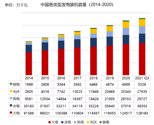 新能源的發(fā)展是《方案》中著力描寫的重要篇章。對于風電與太陽能發(fā)電,所采取的原則是“全面推進”;對于水電,開發(fā)的原則是“因地制宜”;對于核電,需要“積極安全有序發(fā)展”。此外,生物質發(fā)電、地熱能以及波浪能、潮流能、溫差能等新能源的開發(fā)利用也有所提及,也將成為我國近十年內探索發(fā)展的重要領域。國家能源局最新數(shù)據(jù)顯示,截至2021年第3季度末,我國風電和太陽能發(fā)電合計裝機容量合計5.8億千瓦,距離《方案》中要求的到2030年風光發(fā)電總裝機容量達到12億千瓦以上還有超過一倍的差距。未來十年,風光發(fā)電的裝機容量需要達到每年近8.5%的增長,水電需要在十四五和十五五期間分別新增4000萬千瓦裝機,對應現(xiàn)有水電裝機容量合計共增長近20%,才能滿足我國碳達峰行動方案的目標要求。
