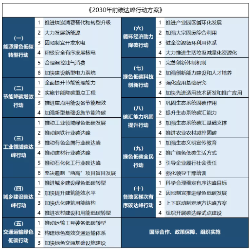 《2030年前碳達峰行動方案》作為我國對于碳達峰行動方案的總體規(guī)劃,提出了“碳達峰十大行動”,包含了43條具體工作內容,對經(jīng)濟社會發(fā)展的各個領域構建了全面、細致且量化的行動方案和工作目標,對于十四五和十五五時期重點領域的細分政策出臺形成了重要的指引。行動方案的主要內容如下表所示,包括上述的“碳達峰十大行動”以及國際合作、政策保障、組織實施三方面的保障措施。