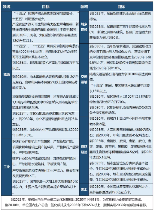 由于《方案》中的十條行動內容覆蓋我國碳達峰實現(xiàn)路徑上的方方面面,本文對《方案》中提到的約束性目標做出了簡要歸納,絕大多數(shù)目標均設定了量化的指標,對未來十年的關鍵領域發(fā)展具有極強的指引作用。具體內容如下表所示。