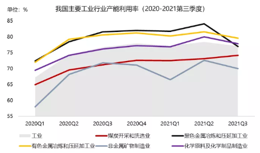 對于工業(yè)領域的碳達峰行動,除了在節(jié)能降碳增效環(huán)節(jié)提到的推動鋼鐵、有色金屬、建材、石化化工等行業(yè)開展節(jié)能降碳改造之外,《方案》對于重點行業(yè)的碳達峰行動還進行了詳細規(guī)劃。整體的思路為優(yōu)化產(chǎn)業(yè)結構,加快退出落后產(chǎn)能。其中鋼鐵行業(yè)是“嚴格執(zhí)行產(chǎn)能置換,嚴禁新增產(chǎn)能,推進存量優(yōu)化,淘汰落后產(chǎn)能”,有色金屬行業(yè)是“嚴格執(zhí)行產(chǎn)能置換,嚴控新增產(chǎn)能”,建材行業(yè)是“加強產(chǎn)能置換監(jiān)管,加快低效產(chǎn)能退出,嚴禁新增水泥熟料、平板玻璃產(chǎn)能”,石化化工行業(yè)是“優(yōu)化產(chǎn)能規(guī)模和布局,加大落后產(chǎn)能淘汰力度,嚴格項目準入”,體現(xiàn)了不同領域側重略有不同,但均為嚴格準入、控制產(chǎn)能的行動方案。從我國目前主要工業(yè)的產(chǎn)能利用率情況來看,《方案》所提及的相關行業(yè)的產(chǎn)能利用率在2020年來均處于85%以下的水平,最近2021年第三季度基本處于70%-80%區(qū)間,呈現(xiàn)中輕度的產(chǎn)能過剩的現(xiàn)象。由于工業(yè)是產(chǎn)生碳排放的主要領域之一,淘汰落后過剩產(chǎn)能,實現(xiàn)工業(yè)產(chǎn)能的轉型優(yōu)化,將是助力我國碳達峰的重要工作之一。