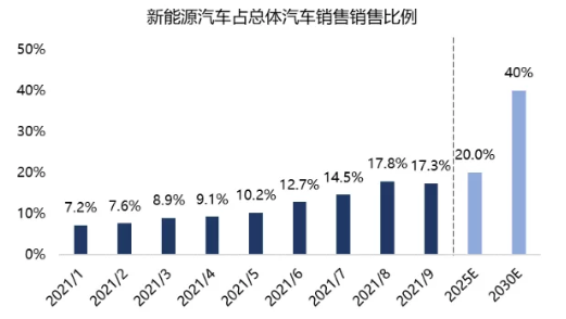交通運輸領域則是要加快形成綠色低碳的運輸方式,主要行動集中于運輸工具裝備的低碳轉型、綠色化交運體系的構建以及綠色交通基礎設施的建設三個方面。對于運輸工具裝備的低碳轉型,我們看到《方案》明確提出了積極擴大電力、氫能、天然氣、先進生物液體燃料等新能源和清潔能源在交通運輸領域的應用,并對到2030年當年新增新能源、清潔能源動力的交通工具比例提出了達到40%左右的要求。根據(jù)汽車工業(yè)協(xié)會的統(tǒng)計數(shù)據(jù),2021年前9個月,各月新能源汽車銷售占總體比例呈現(xiàn)顯著的增長趨勢,到2021年8月,該比例已增長至超過17%,接近《新能源汽車產(chǎn)業(yè)發(fā)展規(guī)劃(2021—2035年)》中對2025年設置的20%的目標。未來十年內,按照《方案》的規(guī)劃,到2030年該比例還要增長一倍至40%左右。然而按照當前的趨勢來看,新能源車的加速發(fā)展可能比預期更快,可以期待到2030年,得益于新能源汽車的蓬勃發(fā)展,加之其他陸路交通工具的能效提升,帶動陸路交通運輸石油消費在2030年前達到峰值。