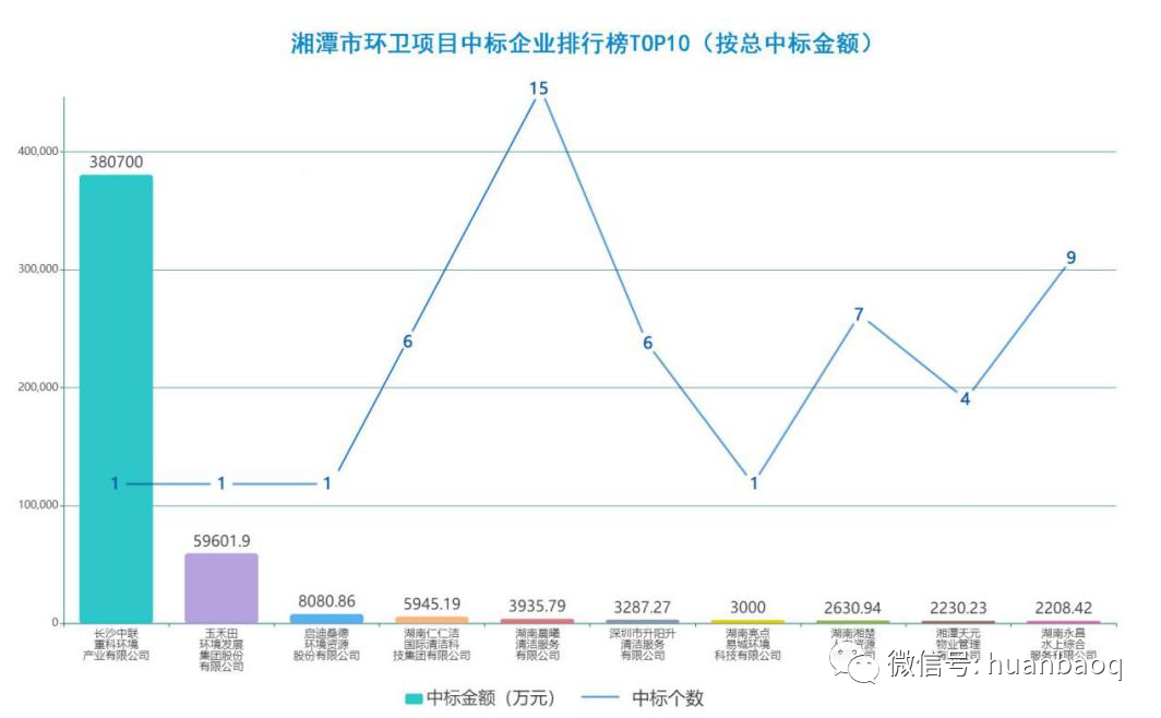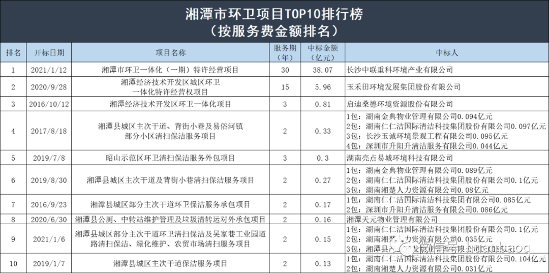 不過,換個(gè)角度,如果從中標(biāo)金額看,盈峰中聯(lián)則是最大的勝利者,雖然只中標(biāo)一個(gè)項(xiàng)目,但是服務(wù)費(fèi)高達(dá)38.07億元,位列第一;第二和第三分別為玉禾田和啟迪桑德環(huán)境,中標(biāo)金額分別為59601.9萬元和8080.86萬元,其實(shí)這兩家公司也僅僅中標(biāo)了一個(gè)項(xiàng)目。? 首先值得注意的是本地“巨鱷”——長沙中聯(lián)重科環(huán)境產(chǎn)業(yè)有限公司。剛剛過去的8月21日,盈峰中聯(lián)發(fā)布了2021年半年度報(bào)告,營收54.48億元,歸母凈利潤3.71億元。報(bào)告期內(nèi),公司環(huán)衛(wèi)服務(wù)營業(yè)收入實(shí)現(xiàn)13.53億元,同比增長68.64%,成功突破廣州、蘇州、武漢、中山、三亞等15個(gè)地級(jí)市首次落地環(huán)衛(wèi)服務(wù)項(xiàng)目,市場開拓能力顯著。在湖南本地環(huán)衛(wèi)市場上,該公司今年也斬獲了多個(gè)億級(jí)項(xiàng)目:·2021年1月12日,中標(biāo)湘潭市環(huán)衛(wèi)一體化(一期)特許經(jīng)營項(xiàng)目,項(xiàng)目特許經(jīng)營期限30年,總服務(wù)費(fèi)約為38.07億元;·2021年5月31日,中標(biāo)邵陽市新寧縣城鄉(xiāng)環(huán)衛(wèi)一體化項(xiàng)目特許經(jīng)營項(xiàng)目,合計(jì)投標(biāo)總價(jià)4.81億元,服務(wù)期15年(含建設(shè)期1年);·2021年7月19日,中標(biāo)湘西土家族苗族自治州鳳凰縣城鄉(xiāng)生活垃圾收轉(zhuǎn)運(yùn)一體化服務(wù)采購項(xiàng)目,服務(wù)期限8年,總服務(wù)金額約為2.14億;中標(biāo)價(jià)231元/噸,項(xiàng)目日轉(zhuǎn)運(yùn)規(guī)模317.62噸(保底量設(shè)定為300噸/天,超出部分據(jù)實(shí)結(jié)算)。鑒于盈峰中聯(lián)在行業(yè)內(nèi)的強(qiáng)悍實(shí)力和湖南本土企業(yè)的地區(qū)優(yōu)勢,筆者預(yù)測未來很長時(shí)間內(nèi),他將持續(xù)稱霸湘潭市環(huán)衛(wèi)市場。根據(jù)2021年上半年年報(bào),玉禾田營業(yè)收入約23.98億元,同比增長16.61%。此項(xiàng)數(shù)據(jù)已經(jīng)超過了該企業(yè)去年全年?duì)I收的一半。在湖南省環(huán)衛(wèi)市場上,玉禾田也有一定的收獲,中標(biāo)的湘潭市項(xiàng)目是該地區(qū)唯二的億級(jí)環(huán)衛(wèi)項(xiàng)目:·2020年9月28日,中標(biāo)湘潭經(jīng)濟(jì)技術(shù)開發(fā)區(qū)城區(qū)環(huán)衛(wèi)一體化特許經(jīng)營權(quán)項(xiàng)目,服務(wù)期15年,服務(wù)費(fèi)5.96億元。·2021年4月21日,中標(biāo)株洲市蘆淞區(qū)環(huán)衛(wèi)服務(wù)項(xiàng)目,中標(biāo)金額為1.35億元,服務(wù)期3年。本項(xiàng)目分為9個(gè)包組,玉禾田中標(biāo)包2,服務(wù)費(fèi)3217.33萬元。作為一個(gè)外地企業(yè),玉禾田已經(jīng)在湖南省內(nèi)成功打開了局面,期待他有更好的表現(xiàn)。? 排名第三的是啟迪桑德環(huán)境資源股份有限公司。對(duì)湘潭市環(huán)衛(wèi)市場而言,啟迪環(huán)境入局時(shí)間很早。2016年10月12日,啟迪桑德環(huán)境中標(biāo)湘潭經(jīng)濟(jì)技術(shù)開發(fā)區(qū)環(huán)衛(wèi)一體化項(xiàng)目,但此后,就再也未能見到該企業(yè)中標(biāo)湘潭市環(huán)衛(wèi)項(xiàng)目的信息。近年來,啟迪環(huán)境常被負(fù)面信息纏身。根據(jù)啟迪環(huán)境2021年上半年業(yè)績預(yù)告,預(yù)計(jì)2021年上半年虧損33億元至40億元,相較于上年同期的盈利1.81億元,同比大降1927%—2315%。對(duì)啟迪環(huán)境來說,解決財(cái)務(wù)問題的最大的轉(zhuǎn)機(jī)或許是1月11日城發(fā)環(huán)境發(fā)布的擬換股吸收合并事件。啟迪環(huán)境是否能通過和城發(fā)“聯(lián)姻”緩解資金鏈危機(jī)?此次行業(yè)矚目的合作是否能有“實(shí)錘”?我們將拭目以待。此外,榜單中的湖南仁仁潔國際清潔科技集團(tuán)有限公司、湖南晨曦清潔服務(wù)有限公司、湖南亮點(diǎn)易城環(huán)境科技有限公司均為湖南本地環(huán)衛(wèi)企業(yè)。湖南湘楚人力資源有限公司、湘潭天元物業(yè)管理有限公司都屬于非環(huán)衛(wèi)企業(yè),湖南永昌水上綜合服務(wù)有限公司則屬于水上運(yùn)輸服務(wù)業(yè)。另外一點(diǎn)值得注意的是,目前榜首的10家企業(yè)均為私企,顯示地方國企在湘潭市環(huán)衛(wèi)市場上明顯發(fā)力不足。