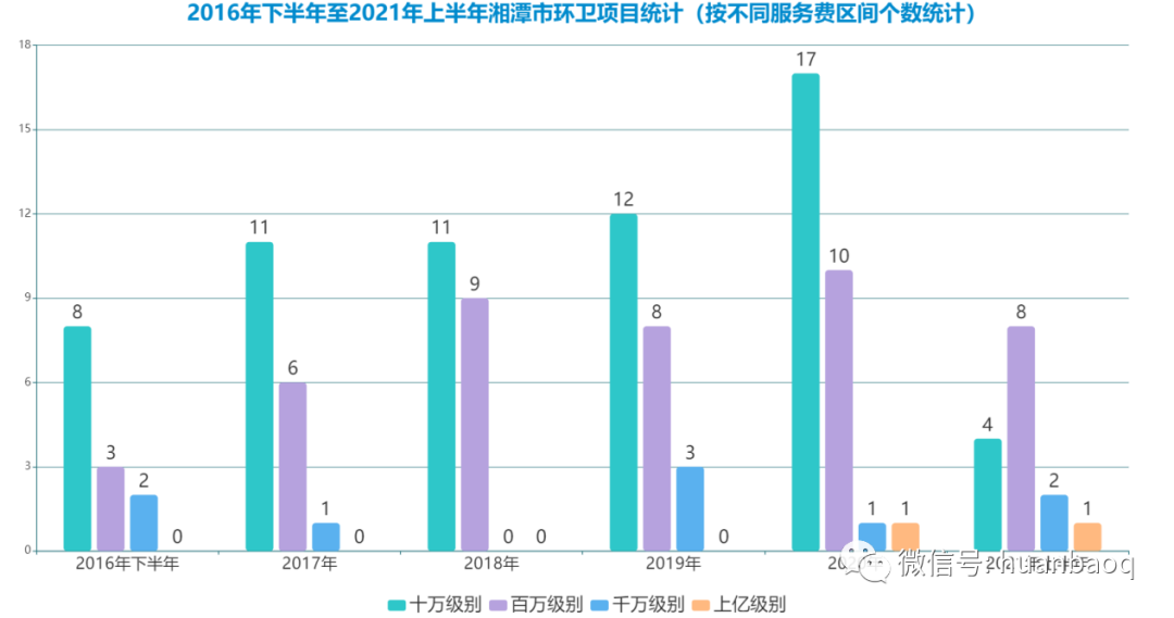 環(huán)衛(wèi)市場是近年來環(huán)保產(chǎn)業(yè)中增長最快的細(xì)分板塊之一。據(jù)中商產(chǎn)業(yè)研究院報(bào)告顯示,2014年到2018年,我國環(huán)衛(wèi)市場規(guī)模由1392億元增加到了2632億元,四年間增長了89%。預(yù)計(jì)到2020年,市場規(guī)模還將進(jìn)一步增至3473億元。環(huán)衛(wèi)市場爆發(fā)的邏輯是什么?在這個(gè)新興的板塊,又是哪些企業(yè)享受到了發(fā)展的紅利?突然爆發(fā)的環(huán)衛(wèi)市場,給下游垃圾末端處置市場帶來了什么樣的影響?應(yīng)該說,這是一個(gè)很大的話題,《環(huán)保圈》試圖用“解剖麻雀”的方法,通過研究一個(gè)典型城市——湖南省湘潭市,來回答上述這些疑問。希望我們的研究,能夠?yàn)殛P(guān)心環(huán)衛(wèi)市場的讀者提供一些價(jià)值。湘潭市環(huán)衛(wèi)市場化始于2013年。2013年3月15日,湘潭市城管委就推進(jìn)湘潭市環(huán)衛(wèi)作業(yè)社會(huì)化、市場化下發(fā)了《湘潭市推進(jìn)環(huán)衛(wèi)作業(yè)市場化工作的指導(dǎo)性意見》(潭城管〔2013〕7號(hào))文件,要求全市各縣市區(qū)加快推進(jìn)環(huán)衛(wèi)事業(yè)的市場化。之后,湘潭市開始了環(huán)衛(wèi)市場化的試點(diǎn)工作。2013年至2014年,昭山示范區(qū)、湘潭縣、高新區(qū)、湘潭經(jīng)開區(qū)、雨湖區(qū)等相繼開始嘗試政府購買環(huán)衛(wèi)服務(wù),東莞家寶園林綠化有限公司、湖南金典物業(yè)有限公司等企業(yè)成為“第一批吃螃蟹的人”。據(jù)筆者統(tǒng)計(jì),2016年下半年至2021年上半年,湘潭市環(huán)衛(wèi)市場(前端)中標(biāo)項(xiàng)目服務(wù)費(fèi)金額總計(jì)近50億元。從已知數(shù)據(jù)來看,2019年以前,湘潭市環(huán)衛(wèi)項(xiàng)目發(fā)布數(shù)量均在每年20個(gè)左右,單個(gè)項(xiàng)目服務(wù)費(fèi)多為十萬級(jí)別,百萬級(jí)別以上的較少,服務(wù)期多為1年,環(huán)衛(wèi)市場化程度不高。可是,從2020年開始,湘潭市環(huán)衛(wèi)市場化進(jìn)入了發(fā)展“快車道”,項(xiàng)目發(fā)布數(shù)量明顯提升,千萬級(jí)項(xiàng)目、億級(jí)項(xiàng)目如雨后春筍般冒了出來。那么,這些大項(xiàng)目都被誰中標(biāo)了?該市的環(huán)衛(wèi)市場又有哪些特點(diǎn)呢?