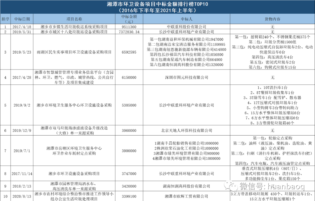 從上圖可以明顯看出,湘潭市2019年共發(fā)布38個(gè)環(huán)衛(wèi)裝備項(xiàng)目,總金額合計(jì)近6千萬,不論是項(xiàng)目個(gè)數(shù)還是總金額,都是2016年以來最高的一年。能查到中標(biāo)金額的130個(gè)項(xiàng)目中,中標(biāo)金額最高的是2017年4月18日開標(biāo)的湘鄉(xiāng)市鄉(xiāng)鎮(zhèn)生活垃圾收運(yùn)系統(tǒng)采購項(xiàng)目,中標(biāo)金額951.14萬元,中標(biāo)人為中聯(lián)重科股份有限公司,貨物內(nèi)容詳情并未公示。▼以下為湘潭市環(huán)衛(wèi)設(shè)備項(xiàng)目中標(biāo)金額TOP10排行榜:
