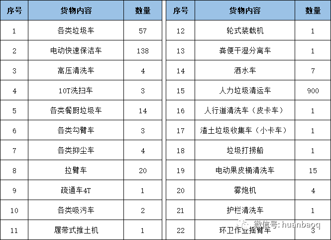 此外,131個(gè)環(huán)衛(wèi)裝備項(xiàng)目中,有56個(gè)項(xiàng)目并未公布采購內(nèi)容。在可查詢到采購詳情的75個(gè)項(xiàng)目中,貨物采購內(nèi)容可分為以下幾類:其中,環(huán)衛(wèi)車輛、垃圾桶等是采購頻率較高的貨物。75個(gè)項(xiàng)目中,環(huán)衛(wèi)車輛共計(jì)1182輛,大致可分為以下22個(gè)類型。其中,人力垃圾清運(yùn)車、電動(dòng)快速保潔車、各類垃圾車采購量最高。