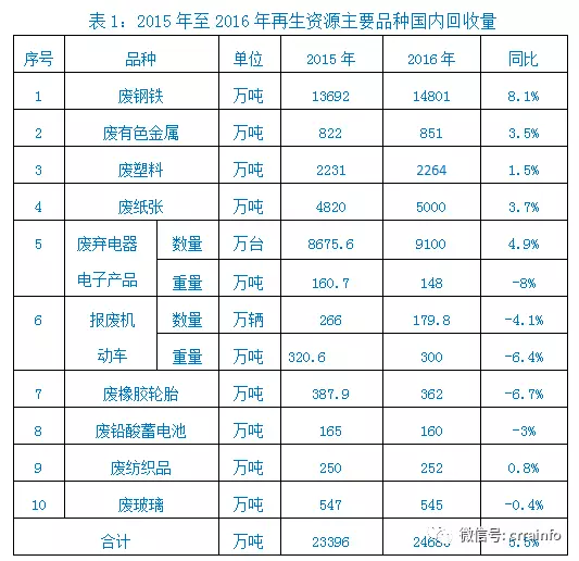 1、回收量。在宏觀經(jīng)濟(jì)形勢總體下行的背景下,再生資源回收行業(yè)總體規(guī)模不但沒有出現(xiàn)大幅下滑,而且有了一定幅度的增長。據(jù)中再生協(xié)會(huì)統(tǒng)計(jì)顯示,2016年,廢鋼、廢有色金屬、廢塑料、廢紙、廢棄電器電子產(chǎn)品、報(bào)廢汽車、廢橡膠輪胎、廢鉛酸蓄電池、廢紡織品、廢玻璃等10個(gè)主要品種國內(nèi)回收量2.47億噸(見表1),比2015年同比增長5.5%。