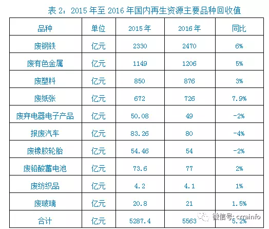 2、回收值。2016年,廢鋼、廢有色金屬、廢塑料、廢紙、廢棄電器電子產(chǎn)品、報(bào)廢汽車、廢橡膠輪胎、廢鉛酸蓄電池等10個(gè)主要品種國內(nèi)回收值5563億元(見表2),比2015年同比增長5.2%,扭轉(zhuǎn)了近幾年回收值連續(xù)大幅下滑的趨勢,實(shí)現(xiàn)了一定增長,提示著再生資源行業(yè)開始進(jìn)入初春。