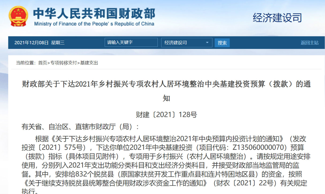 也就是說,農(nóng)村人居環(huán)境整治提升,主要的資金來源還是要靠地方。中央這邊,會安排一定的中央預(yù)算內(nèi)投資,給予獎(jiǎng)補(bǔ)。查了一下,今年5月12日,財(cái)政部就曾經(jīng)下達(dá)“2021年鄉(xiāng)村振興專項(xiàng)農(nóng)村人居環(huán)境整治中央基建投資預(yù)算(撥款)”,總額為29.6億元.去年8月,財(cái)政部也曾經(jīng)下達(dá)2020年的“農(nóng)村人居環(huán)境整治專項(xiàng)中央基建投資預(yù)算(撥款)”,當(dāng)時(shí)的總額是29.756億元。從這兩年的情況看,每年全國大概30億吧,這是中央拿出來的錢。地方各級政府要保障農(nóng)村人居環(huán)境整治基礎(chǔ)設(shè)施建設(shè)和運(yùn)行資金,統(tǒng)籌安排土地出讓收入用于改善農(nóng)村人居環(huán)境,鼓勵(lì)各地通過發(fā)行地方政府債券等方式用于符合條件的農(nóng)村人居環(huán)境建設(shè)項(xiàng)目。看得出來,地方政府的投入,主要來源是兩個(gè):一是土地出讓金,二是發(fā)行地方債。
