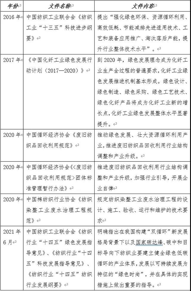 標(biāo)準(zhǔn)指導(dǎo)層面,《綠色產(chǎn)業(yè)指導(dǎo)目錄(2019年版)》將廢舊紡織品無害化再生利用裝備、紡織印染等高用水行業(yè)廢水處理回用裝置以及廢舊紡織品等廢舊資源的再生利用列入節(jié)能環(huán)保產(chǎn)業(yè),將紡織行業(yè)的園區(qū)產(chǎn)業(yè)鏈接循環(huán)化改造列入清潔生產(chǎn)產(chǎn)業(yè)。將紡織面料等產(chǎn)品的低碳產(chǎn)品認證和推廣列入綠色服務(wù)。