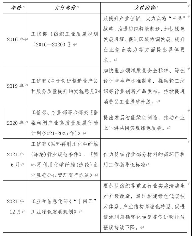 國家政策層面,自2016年起工信部聯(lián)合各部委陸續(xù)發(fā)布多個工業(yè)、制造業(yè)高質(zhì)量發(fā)展實施意見,其中多次提到紡織行業(yè)作為重要領(lǐng)域,要加快綠色制造、綠色設(shè)計,推動行業(yè)循環(huán)再利用,促進行業(yè)高質(zhì)量綠色發(fā)展。