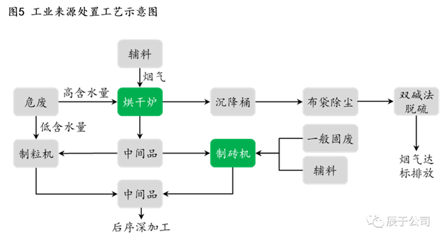 工業(yè)來源的再生有色金屬工藝相比復雜很多,一是原料種類繁多,有廢水、固廢等形態(tài);二是含量低且多數(shù)為有害物質(zhì),雖然也有含量高的生產(chǎn)邊角料,但大多是工業(yè)危廢,含量通常不高于5%。因此工業(yè)來源的處置工藝通常要根據(jù)具體的原料進行處置,輔料、設(shè)備的投入更多,對企業(yè)的技術(shù)要求很高(見圖5)。