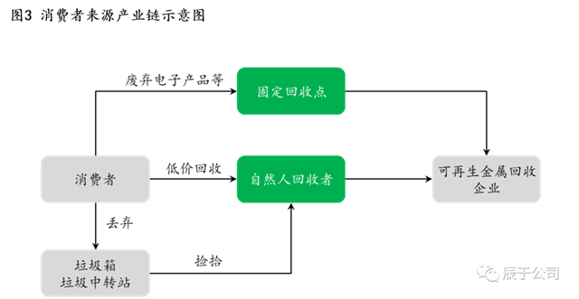 “消費者來源”的回收產(chǎn)業(yè)鏈渠道相對較多且發(fā)達,中間商的活動也十分活躍,多為自然人采購,不穩(wěn)定因素多,回收原料主要為電子產(chǎn)品等含可回收金屬的家用電器(見圖3)。例如飛南資源早期采用的是自然人采購這一特殊的采購模式,依托專門從事廢銅回收的自然人,2017-2018年間,向自然人采購占比超過四成。“消費者來源”的回收率較高,基本上只要能值錢就會有人專門在收集、轉(zhuǎn)賣,更何況有色金屬單價高,廢銅的受歡迎程度比廢鐵要高得多。中國的易拉罐回收率超過99%也能夠說明這一點。