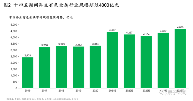 供給和需求的不平衡下,再生有色金屬作為重要的替代方式空間巨大。我國《“十四五”循環(huán)經(jīng)濟發(fā)展規(guī)劃》等政策對再生有色金屬寄予厚望,例如到2025年再生銅產(chǎn)量要達到400萬噸,與2020年相比增長23%,再生鋁產(chǎn)量要達到1500萬噸,與2020年相比增長55%。結(jié)合價格預測,辰于認為十四五期間再生有色金屬行業(yè)規(guī)模將處于4500億元左右,市場空間巨大(見圖2)。