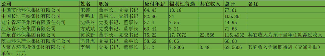 2021年的最后一天,國(guó)務(wù)院國(guó)資委發(fā)布《2020年度中央企業(yè)負(fù)責(zé)人薪酬披露》,公布了96家中央企業(yè)負(fù)責(zé)人的薪酬水平。其中,與環(huán)保行業(yè)有關(guān)的主要是兩家企業(yè),一家是中國(guó)節(jié)能環(huán)保集團(tuán)有限公司(下稱“中節(jié)能”),另一家是中國(guó)長(zhǎng)江三峽集團(tuán)有限公司(下稱“三峽集團(tuán)”)。兩家企業(yè),都是國(guó)家實(shí)施“長(zhǎng)江大保護(hù)”戰(zhàn)略的平臺(tái)型公司,作用都非常重要。兩家企業(yè)中,三峽集團(tuán)負(fù)責(zé)人的薪酬水平略高,董事長(zhǎng)、黨組書(shū)記雷鳴山的應(yīng)付年薪和福利性待遇(主要指社會(huì)保險(xiǎn)、企業(yè)年金、補(bǔ)充醫(yī)療保險(xiǎn)及住房公積金)總計(jì)達(dá)到106.86萬(wàn)元,而中節(jié)能董事長(zhǎng)、黨委書(shū)記宋鑫則為77.61萬(wàn)元。看完“國(guó)家隊(duì)”的,再來(lái)看看地方環(huán)保集團(tuán)的。在國(guó)務(wù)院國(guó)資委公布央企負(fù)責(zé)人薪酬水平的同時(shí),各地方國(guó)資委也公布了2020年度省屬企業(yè)負(fù)責(zé)人的薪酬信息,北極星環(huán)保網(wǎng)專門(mén)整理了5家地方環(huán)保集團(tuán)企業(yè)負(fù)責(zé)人的薪酬情況。這5家地方環(huán)保集團(tuán)分別是:遼寧省環(huán)保集團(tuán)有限責(zé)任公司、江蘇省環(huán)保集團(tuán)有限公司、廣東省環(huán)保集團(tuán)有限公司、陜西環(huán)保產(chǎn)業(yè)集團(tuán)有限責(zé)任公司和內(nèi)蒙古環(huán)保投資集團(tuán)有限公司。5家企業(yè)中,企業(yè)負(fù)責(zé)人薪酬最高的是廣東省環(huán)保集團(tuán)有限公司,其董事長(zhǎng)、黨委書(shū)記黃敦新應(yīng)付年薪為75.22萬(wàn)元,福利性待遇17.7072萬(wàn)元,另外還有22.5660萬(wàn)元的預(yù)計(jì)當(dāng)年任期激勵(lì)收入,合計(jì)一共是115.4932萬(wàn)元。薪酬最低的,是遼寧省環(huán)保集團(tuán)有限責(zé)任公司,黨委書(shū)記、董事長(zhǎng)沈鐵冬應(yīng)付年薪37.40萬(wàn)元,福利性待遇7.55萬(wàn)元,總計(jì)44.95萬(wàn)元。其余3家企業(yè),負(fù)責(zé)人薪酬水平都差不太多,基本在60萬(wàn)元-70萬(wàn)元之間。全部看下來(lái),可以看出,無(wú)論是“國(guó)家隊(duì)”還是地方環(huán)保集團(tuán),企業(yè)負(fù)責(zé)人的薪酬水平都不能算太高,超過(guò)100萬(wàn)元的已屬于鳳毛麟角,大部分都在60萬(wàn)元-70萬(wàn)元左右。相對(duì)來(lái)說(shuō),南方企業(yè)總體來(lái)講比北方企業(yè)的薪酬水平要高一點(diǎn)。例如廣東、江蘇的地方環(huán)保集團(tuán),企業(yè)負(fù)責(zé)人薪酬就要比陜西、內(nèi)蒙古高,而遼寧在已公布的幾個(gè)省份中則是最低。▼2家環(huán)保央企和5家地方環(huán)保集團(tuán)企業(yè)負(fù)責(zé)人薪酬信息。制圖:環(huán)保圈看完環(huán)保行業(yè)央企和地方國(guó)資的高管薪酬情況,再來(lái)看看民企的。這方面,主要信息來(lái)源是各大環(huán)保上市公司的2020年的年報(bào)。具體的數(shù)據(jù),《環(huán)保圈》去年曾經(jīng)總結(jié)過(guò),這里直接說(shuō)結(jié)論。首先,我們統(tǒng)計(jì)了217位上市環(huán)保企業(yè)高管的薪酬水平,平均值是每人97萬(wàn)元/年,接近“百萬(wàn)元”吧。其次,雖然平均值達(dá)到了“百萬(wàn)元”,但具體來(lái)看,每個(gè)人的情況差別還是很大的。最高的可以拿到625萬(wàn)元,最低的則只有2.4萬(wàn)元,足足相差了260倍。年薪最高的,是盈峰環(huán)境副總裁陳培亮,2020年年薪高達(dá)625萬(wàn)元,可謂是環(huán)保領(lǐng)域的“最強(qiáng)打工人”。排名第二、第三的也是民企,他們分別是格林美的兩位高管——55歲的董事長(zhǎng)許開(kāi)華(587萬(wàn)元/年)和62歲的常務(wù)副總王敏(312萬(wàn)元/年)。此外,年薪在150萬(wàn)元以上的還有:中持股份副總經(jīng)理張翼飛、東江環(huán)保董事長(zhǎng)譚侃、節(jié)能國(guó)禎創(chuàng)始人李煒、東方園林董事長(zhǎng)劉偉杰、博天環(huán)境董事長(zhǎng)趙笠鈞、瀚藍(lán)環(huán)境總經(jīng)理金鐸、清新環(huán)境總裁李其林、維爾利董事長(zhǎng)李月中等。可以看出,這些企業(yè)絕大多數(shù)都是民企(2020年時(shí)中持、國(guó)禎、博天等尚未完成“混改”)。▼年薪過(guò)200萬(wàn)的13位上市環(huán)保企業(yè)高管第三,再看看排名最低的,則來(lái)自于一家國(guó)企。2020年年薪最低的董事長(zhǎng)是富春環(huán)保董事長(zhǎng)萬(wàn)嬌,只有2.5萬(wàn)元,月平均工資約2000元。大家知道,富春環(huán)保是一家剛剛經(jīng)歷了“混改”的企業(yè),2020年南昌市國(guó)資委剛剛?cè)胫?,萬(wàn)嬌則是由南昌國(guó)資提名,代替原董事長(zhǎng)的人選。當(dāng)然,民企高管的薪酬水平也并不一定都很高,也有偏少的。比如中國(guó)天楹,除總裁曹徳標(biāo)年薪36萬(wàn)元外,其余副總裁一律年薪25萬(wàn)元,月工資2.1萬(wàn)。▼中國(guó)天楹高管團(tuán)隊(duì)收入(數(shù)據(jù)/東方財(cái)富網(wǎng))總體來(lái)看,排名靠前、薪酬較高的企業(yè),絕大多數(shù)都是業(yè)績(jī)表現(xiàn)好,坐落于北上廣深的大型環(huán)保上市企業(yè),如盈峰環(huán)境、格林美、中持股份、首創(chuàng)股份、綠色動(dòng)力、清新環(huán