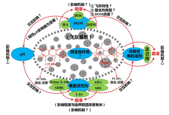 對于穩(wěn)定化飛灰進(jìn)入填埋場后污染物的溶出,國內(nèi)主要限于針對重金屬的浸出毒性模擬實(shí)驗(yàn),而缺乏針對二噁英溶出的相關(guān)研究。與國內(nèi)相比,由于日本、韓國關(guān)于垃圾焚燒殘余物進(jìn)入填埋場的標(biāo)準(zhǔn)制定較早,相關(guān)研究人員對穩(wěn)定化飛灰進(jìn)入填埋場后二噁英的溶出情況關(guān)注也較早。Choi等和Ham等分別對接受焚燒殘?jiān)ㄖ饕堑谆遥蟹且?guī)范共填埋的飛灰,所填埋飛灰是否被穩(wěn)定化處理無從考證)的5座和12座垃圾填埋場滲濾液中PCDD/Fs和PCBs的溶出特性和影響因素進(jìn)行調(diào)查研究。結(jié)果表明兩組填埋場滲濾液中PCDD/Fs濃度分別為4.07~46.22 pg-TEQ/L(平均22.87 pg-TEQ/L)和0.65~5.88 pg-TEQ/L(平均2.86 pg-TEQ/L)。根據(jù)同時(shí)期日本環(huán)境省的調(diào)查數(shù)據(jù),日本生活垃圾填埋場滲濾液中二噁英平均濃度為9.4 pg-TEQ/L。基于上述報(bào)道可設(shè)想,共填埋飛灰是否是所調(diào)研填埋場滲濾液中較高濃度二噁英的貢獻(xiàn)源?若是,現(xiàn)實(shí)填埋處置環(huán)境中存在哪些影響因素會(huì)促進(jìn)飛灰中二噁英的再度溶出?進(jìn)而增加填埋場滲濾液安全處置的環(huán)境風(fēng)險(xiǎn)隱患。這些現(xiàn)實(shí)問題均值得進(jìn)一步探究。 2. 穩(wěn)定化飛灰中二噁英溶出影響因素分析