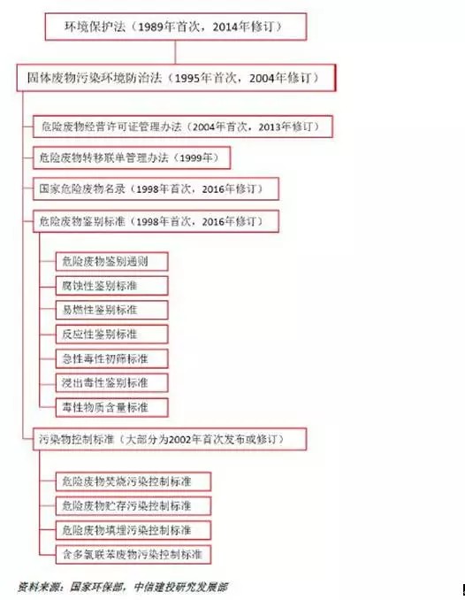 自2012年《“十二五”危險(xiǎn)廢物污染防治規(guī)劃》發(fā)布后,國家將危廢污染防治工作作為環(huán)境保護(hù)的重點(diǎn)領(lǐng)域。有關(guān)危險(xiǎn)廢物管理的法律法規(guī)和技術(shù)規(guī)范也在近幾年間陸續(xù)發(fā)布,加速推進(jìn)了危廢產(chǎn)業(yè)的發(fā)展。以2004年修訂的《固體廢物污染環(huán)境防治法》為龍頭,以2007年修訂的《危險(xiǎn)廢物經(jīng)營許可證管理辦法》和的1999年的《醫(yī)療廢物管理?xiàng)l例》為骨干,以2008年第二次修訂《國家危險(xiǎn)廢物名錄》、2016年第三次修訂《國家危險(xiǎn)廢物名錄》、2013年的《危險(xiǎn)廢物轉(zhuǎn)移聯(lián)單管理辦法》和危險(xiǎn)廢物鑒別、焚燒、填埋標(biāo)準(zhǔn)為枝干,我國已構(gòu)建了一系列危廢處理過程管理制度,進(jìn)一步增加危險(xiǎn)廢物處理量、減少非法處置、推動(dòng)技術(shù)提升及提高危險(xiǎn)廢物處理服務(wù)的需求。