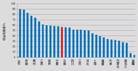 由于國家對(duì)危廢的管理實(shí)行“就近式、集中式”原則,亦使得危廢處理區(qū)域性特點(diǎn)明顯。2014年,工業(yè)危險(xiǎn)廢物綜合利用量較大的省份為山東639.8萬噸,占全國工業(yè)企業(yè)危險(xiǎn)廢物綜合利用量的31.0%;湖南232.5萬噸,占全國工業(yè)企業(yè)的11.3%;青海146.0萬噸,占全國工業(yè)企業(yè)的7.1%;云南137.1萬噸,占全國工業(yè)企業(yè)的6.6%;江蘇125.3萬噸,占全國工業(yè)企業(yè)的6.1%;全國工業(yè)危險(xiǎn)廢物綜合利用率為56.4%。共有11個(gè)省份工業(yè)危險(xiǎn)廢物綜合利用率超過全國平均水平,其中山東、湖南和安徽超過80%。下圖是2014年我國各地區(qū)工業(yè)危險(xiǎn)廢物綜合利用率: