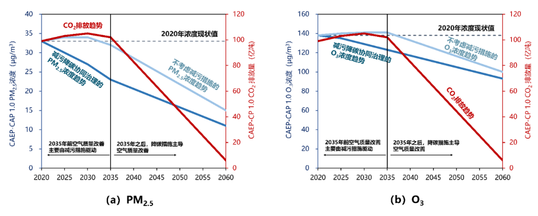 注:PM2.5 濃度為年均值,O3 濃度為 O3 日最大 8 小時全年濃度第 90 百分位數全國均值;數據來源于生態(tài)環(huán)境部環(huán)境規(guī)劃院研究成果 [12]