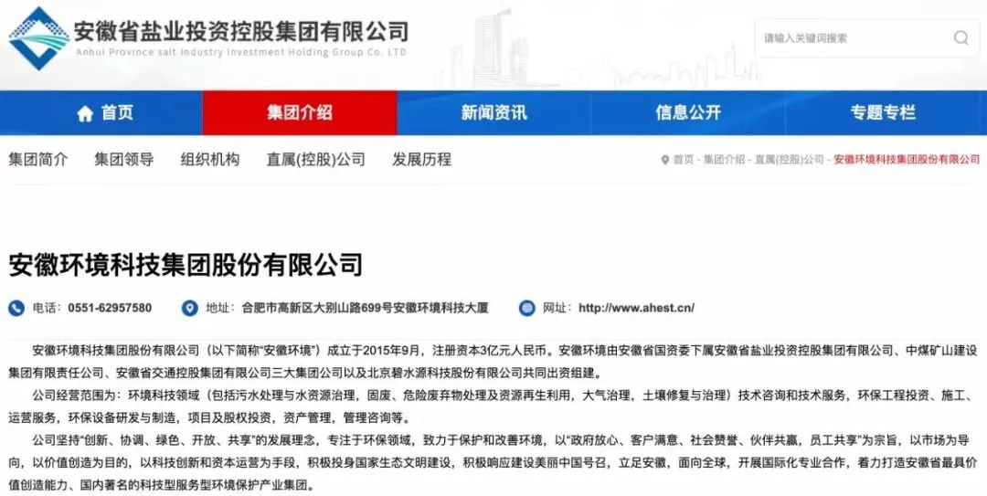 2015年9月,安徽鹽業(yè)集團(tuán)成立安徽環(huán)境科技集團(tuán)股份有限公司(簡稱“安徽環(huán)境”),注冊資本3億元人民幣。