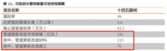 有機構(gòu)預(yù)測稱,“十四五”期間供水管網(wǎng)更新改造帶來的市場空間有望達191億元。