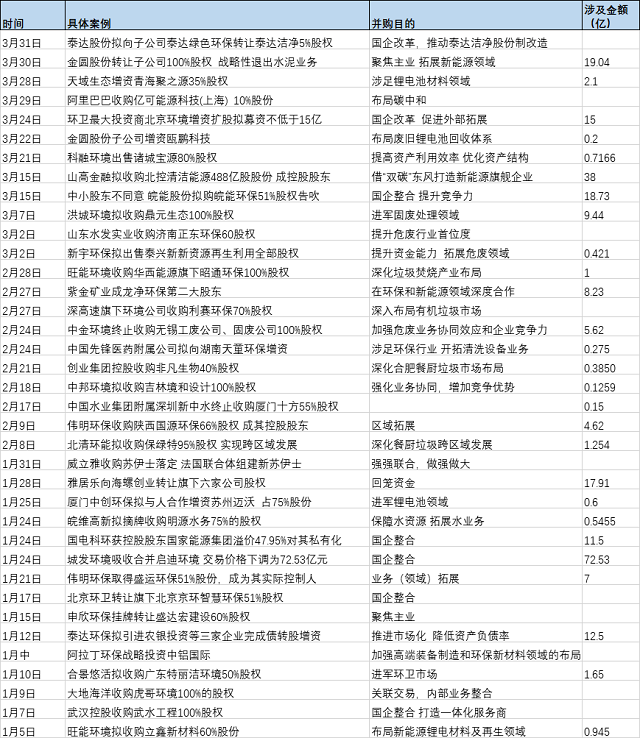 如泰達(dá)股份向子公司泰達(dá)綠色環(huán)保轉(zhuǎn)讓泰達(dá)潔凈5%股權(quán),就是為了推動泰達(dá)潔凈進(jìn)行股份制改造;皖能股份接盤控股股東安徽省能源集團(tuán)持有的安徽皖能環(huán)保發(fā)電有限公司51%股權(quán),是為了避免安徽能源集團(tuán)與皖能環(huán)保發(fā)電的同業(yè)競爭;武漢控股收購武水工程100%股權(quán),是想打造“投建管運(yùn)”一體化服務(wù)商,更好地滿足新時代的環(huán)境治理需求;城發(fā)環(huán)境吸并啟迪環(huán)境,則是為了實(shí)現(xiàn)國企間的戰(zhàn)略整合;而北京環(huán)境引入戰(zhàn)略投資者,據(jù)說是為了突破北京市場,更好地走向全國。而洪城環(huán)境、山東水發(fā)、深高速環(huán)境公司的收購,則主要是為了增強(qiáng)企業(yè)整體以及在固廢包括危廢領(lǐng)域的競爭優(yōu)勢。更多內(nèi)容見下表: