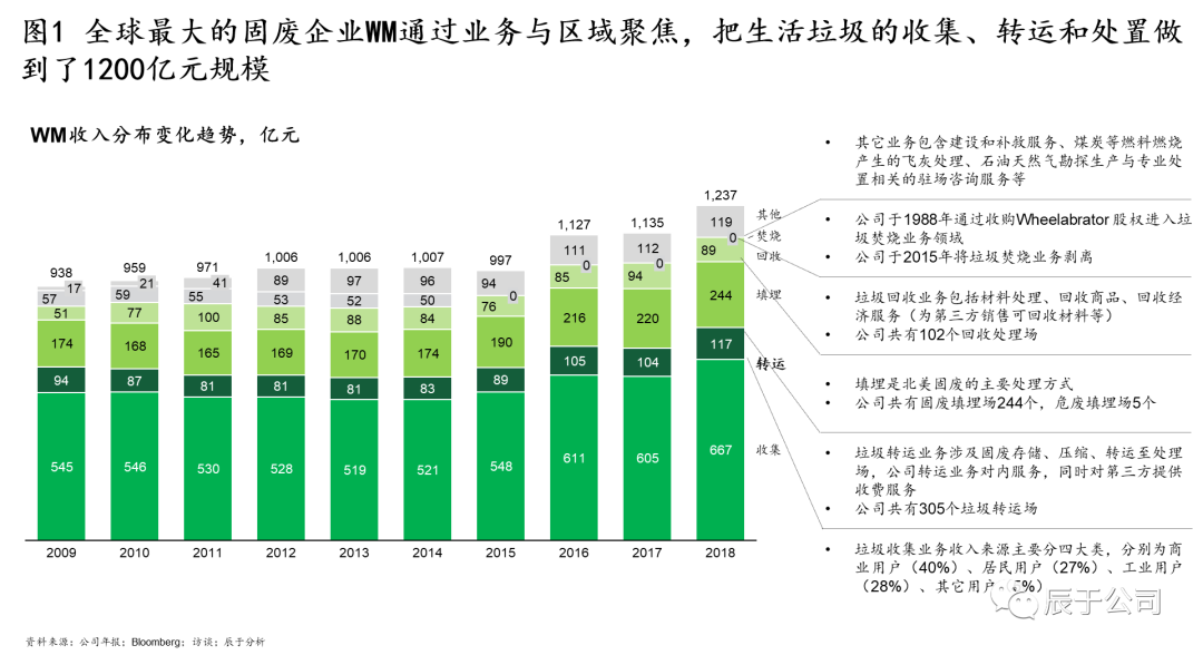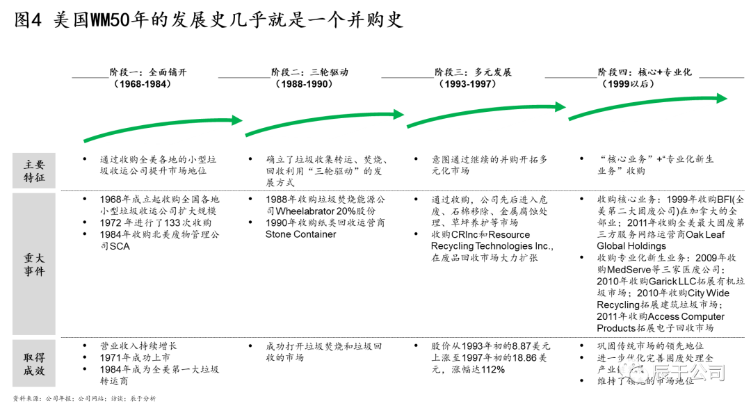 美國WM的50年發(fā)展幾乎就是一個并購史,可分為四個階段(見圖4):1968~1984年全面鋪開階段,通過收購全美各地的小型垃圾收運公司提升市場地位,其中1972 年就進行了133 次收購,1984年收購北美廢物管理公司SCA之后,成為全美第一大垃圾運轉(zhuǎn)商;1988~1990年三輪驅(qū)動階段,確立了垃圾收集轉(zhuǎn)運、焚燒、回收利用“三輪驅(qū)動”的發(fā)展方式,通過并購垃圾焚燒能源公司W(wǎng)heelabrator和紙類回收運營商Stone Container等手段實現(xiàn);1993~1997年多元發(fā)展階段,WM意圖通過大舉并購開拓多元化市場,通過收購先后進入危廢、石棉移除、金屬腐蝕處理、草坪養(yǎng)護等市場,股價從1993年初的8.87美元上漲至1997年初的18.86 美元,漲幅達112%(不過事后證明這個階段的過度多元化并購是失敗的);1999年以后WM開始專注在核心業(yè)務(wù)+專業(yè)化新生業(yè)務(wù)的并購,其中核心業(yè)務(wù)收購了BFI(全美第二大固廢公司)在加拿大的全部業(yè)務(wù)和全美最大固廢第三方服務(wù)網(wǎng)絡(luò)運營商Oak Leaf Global Holdings,這些并購不僅鞏固了WM傳統(tǒng)市場的領(lǐng)先地 U7Y位,也完善了固廢處理全產(chǎn)業(yè)鏈布局。