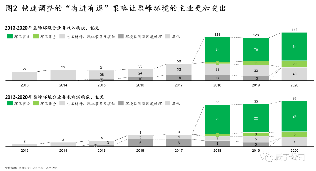 盈峰環(huán)境2015年進入環(huán)保產(chǎn)業(yè),經(jīng)歷過一系列小型并購但毫無起色的彎路之后,2018年開始聚焦環(huán)衛(wèi)行業(yè),當(dāng)年以152.5億元全資收購中聯(lián)環(huán)境,正式進入環(huán)衛(wèi)裝備及環(huán)衛(wèi)運營一體化服務(wù)領(lǐng)域。收購?fù)瓿珊?,環(huán)衛(wèi)裝備及環(huán)衛(wèi)服務(wù)業(yè)務(wù)的占比超過80%,成為公司的核心主業(yè),到2020年收入規(guī)模就達到了143億,幾乎是2017年49億的3倍(見圖2)。