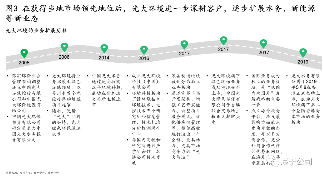 突出主業(yè)的同時,辰于發(fā)現(xiàn)這些領(lǐng)先企業(yè)也特別注意多業(yè)態(tài)的協(xié)同,他們大多涉足水、固、資源/能源等多個板塊,致力于為客戶提供全方位、一攬子解決方案。成為一流的環(huán)境綜合服務(wù)商是他們的一致愿景。