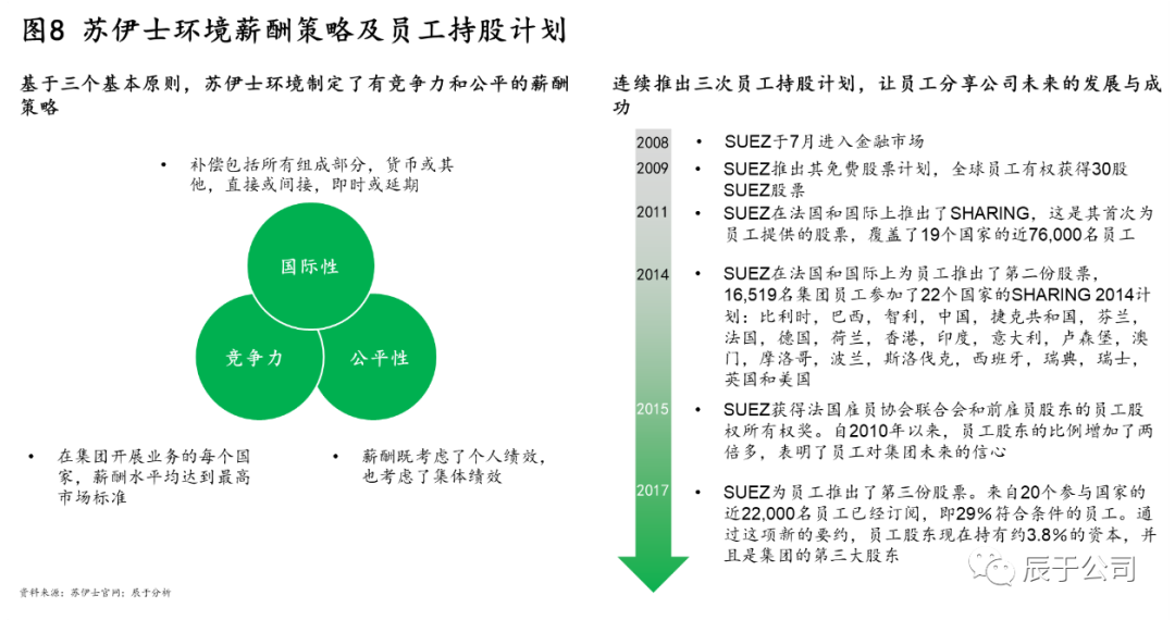 在員工保留方面,蘇伊士通過實施長短結(jié)合的薪酬政策吸引和激勵員工,并持續(xù)推出員工持股計劃讓員工分享公司的發(fā)展與成功。一方面,蘇伊士基于國際性、競爭性和公平性三個原則制定薪酬策略,確保薪酬政策符合當(dāng)?shù)厥袌鲆螅瑫r也確保薪酬水平在當(dāng)?shù)靥幱谳^高水平;另一方面,蘇伊士自2009年開始連續(xù)推出三次員工持股計劃,截至2017年底,員工股東持有約3.8%的股權(quán),并且是集團的第三大股東(如圖8)。