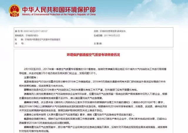 2月19日至20日,2017年第一季度空氣質(zhì)量專項(xiàng)督查的18個(gè)督查組,繼續(xù)對(duì)京津冀及周邊地區(qū)18個(gè)城市大氣污染防治工作進(jìn)行現(xiàn)場(chǎng)督導(dǎo)檢查,共走訪檢查370個(gè)地方政府及相關(guān)部門(mén)和企業(yè),發(fā)現(xiàn)問(wèn)題137個(gè)。
