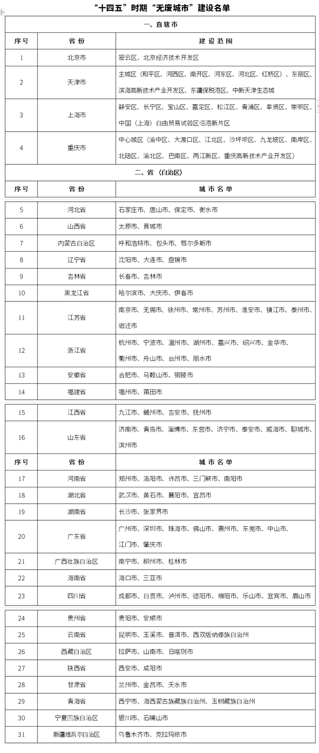 2022年4月24日,生態(tài)環(huán)境部辦公廳公布《關于發(fā)布“十四五”時期“無廢城市”建設名單的通知》,無廢城市建設范圍大公開!其中包括31個省份(自治區(qū)、直轄市),具體城市名單見下: