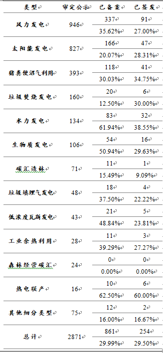 CCER開發(fā)中最主要的項目類型為可再生能源利用,其又可進一步細(xì)分為風(fēng)力發(fā)電、太陽能發(fā)電、垃圾焚燒發(fā)電、水力發(fā)電、生物質(zhì)發(fā)電和地?zé)峁┡^r(nóng)業(yè)項目則包括豬糞便沼氣回收利用、禽類糞便利用和畜牧類糞便利用。此外,碳匯造林、低濃度瓦斯發(fā)電、工業(yè)余熱利用、森林經(jīng)營碳匯、熱電聯(lián)產(chǎn)等類型也均有10個以上的審定項目。備案項目的類型分布與審定項目基本一致,風(fēng)力發(fā)電、太陽能發(fā)電、豬糞便沼氣利用位列前三。林業(yè)碳匯項目受到氣候、降水等不可控因素影響,項目實施過程可能與初始設(shè)計存在偏差,且項目前期產(chǎn)生的碳匯吸收量較少,因此截止2017年CCER備案暫停時其整體簽發(fā)率較低。