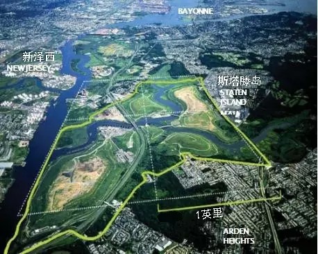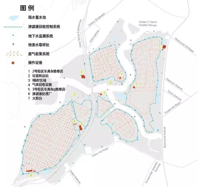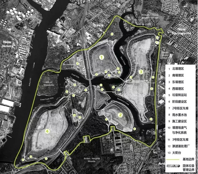弗萊士河垃圾填埋場位于紐約斯塔滕島(圖3),占地面積超過2200英畝(約8.9k㎡),于1948年投入運營,2001年停止接收垃圾。這里曾經是世界上最大的垃圾填埋場,也是1990年代紐約市唯一仍在使用的填埋場。隨著1999年弗萊士河更新計劃的啟動,原有填埋場區(qū)陸續(xù)關閉并封場,直至2001年,填埋場接收了最后一批垃圾——“9?11”事件的世貿中心建筑廢墟。