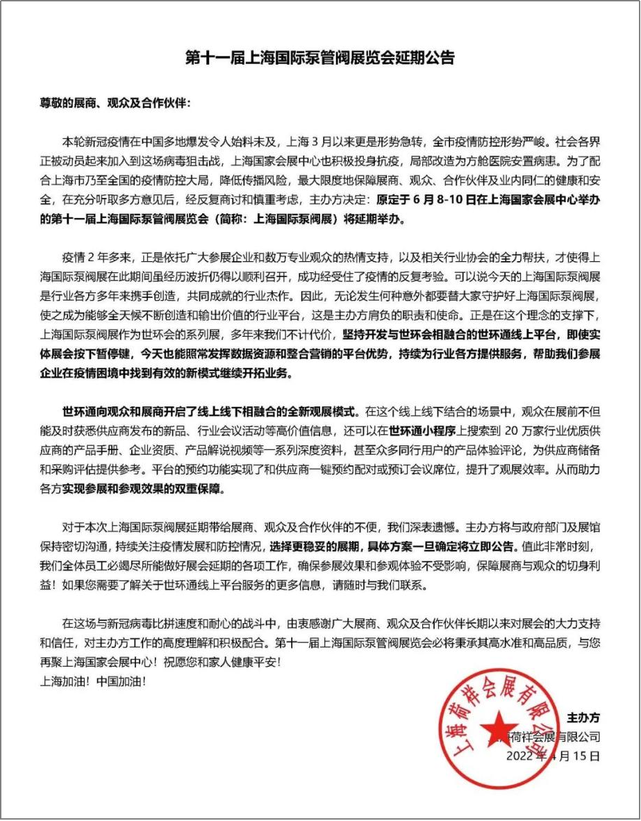 (上海國(guó)際泵閥展延期公告)