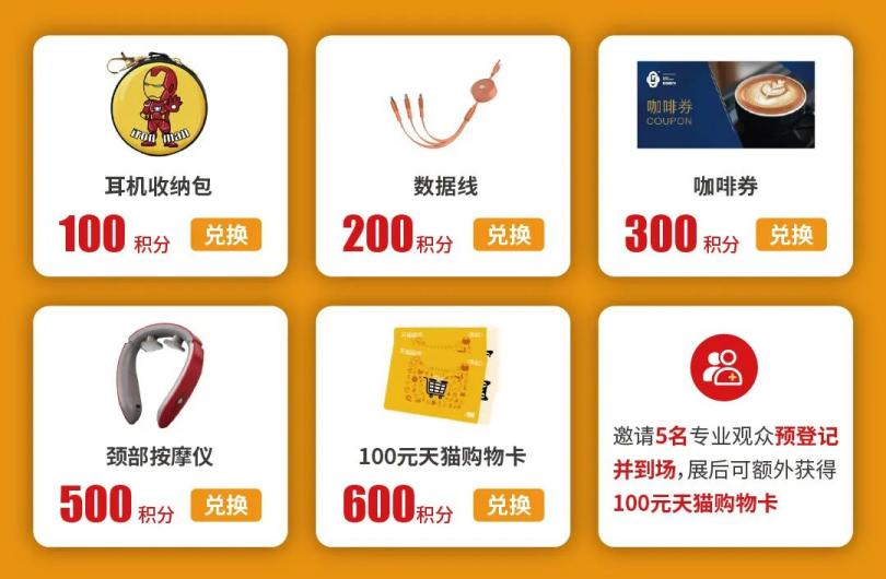 注:積分可在展會(huì)現(xiàn)場(chǎng)兌換天貓購物卡、頸部按摩儀、咖啡券、收納包等精美禮品。