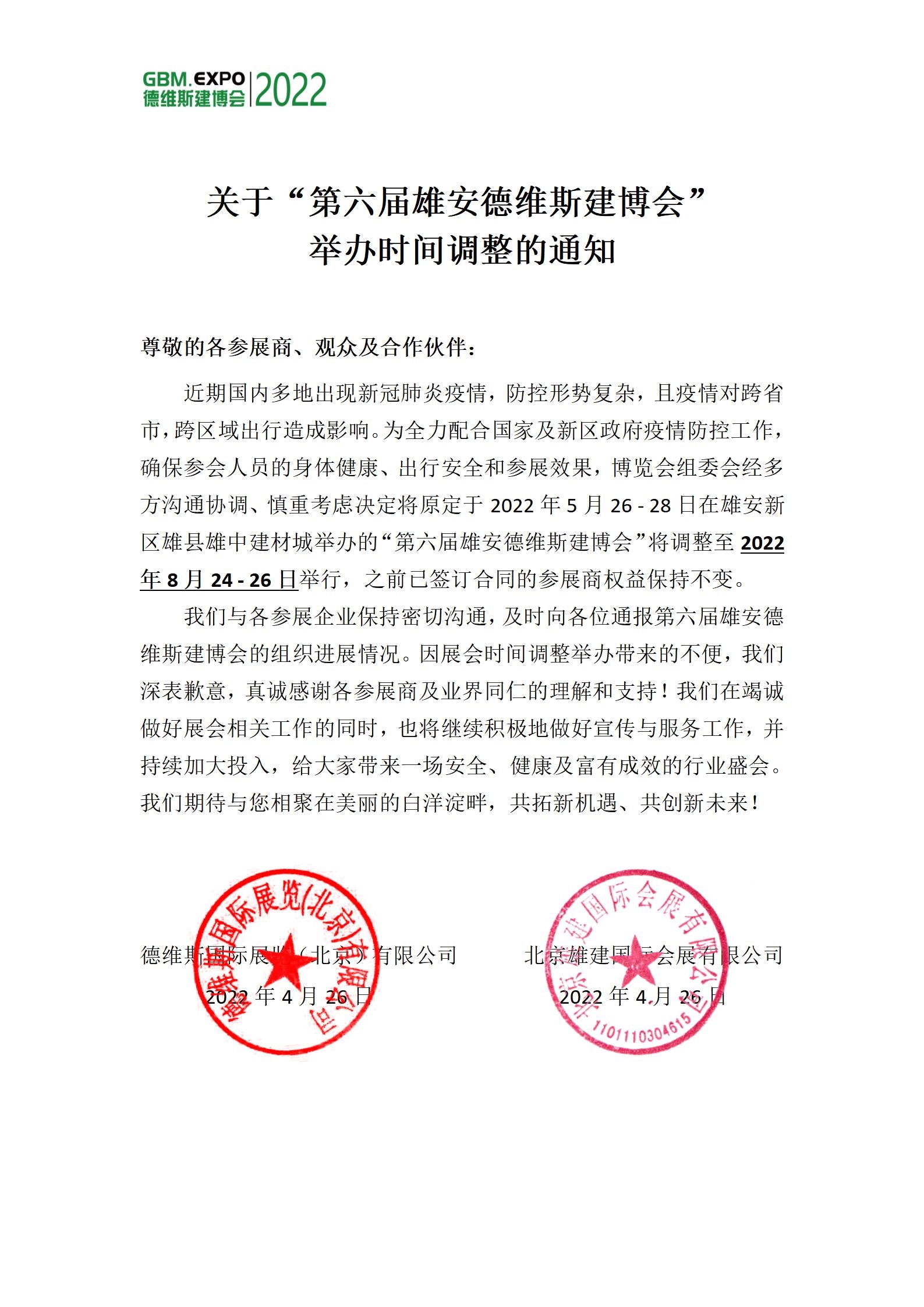 近期國內(nèi)多地出現(xiàn)新冠肺炎疫情,防控形勢復(fù)雜,且疫情對跨省市,跨區(qū)域出行造成影響。為全力配合國家及新區(qū)政府疫情防控工作,確保參會人員的身體健康、出行安全和參展效果,博覽會組委會經(jīng)多方溝通協(xié)調(diào)、慎重考慮決定將原定于2022年5月26-28日在雄安新區(qū)雄縣雄中建材城舉辦的“第六屆雄安德維斯建博會”將調(diào)整至2022年8月24-26日舉行,之前已簽訂合同的參展商權(quán)益保持不變。