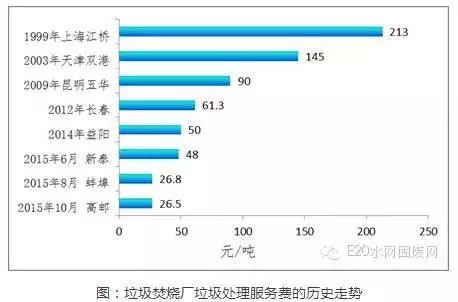 隨著中國城市化的加速,城市人口大幅增加,城市垃圾量也急劇增多,當(dāng)前,城市生活垃圾累積堆存量已達(dá)70億噸,而全國垃圾年產(chǎn)量仍以每年8%-10%的速度增長,與GDP增速匹敵,預(yù)計(jì)截止到2020年,城市垃圾產(chǎn)量將達(dá)約3.23億噸。垃圾焚燒發(fā)電是解決“垃圾圍城”的重要方式之一。由于在實(shí)施垃圾焚燒發(fā)電項(xiàng)目前期投資金額大,故一般采取PPP/BOT方式進(jìn)行,項(xiàng)目投資回收主要依靠上網(wǎng)發(fā)電收入及垃圾處理服務(wù)費(fèi)補(bǔ)貼收入。近16年來,垃圾處理的政府補(bǔ)貼費(fèi)用呈現(xiàn)大幅下跌狀態(tài)(如下圖)。