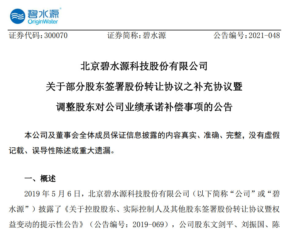 6、《關(guān)于部分股東簽署股份轉(zhuǎn)讓協(xié)議之補(bǔ)充協(xié)議暨調(diào)整股東對公司業(yè)績承諾事項(xiàng)的公告》,碧水源,2021-03-31