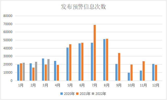 依照《國家突發(fā)事件預(yù)警信息發(fā)布情況月報(bào)》,綜合對比2020年1月——2022年3月數(shù)據(jù)信息可知,全國各部門通過國家預(yù)警發(fā)布系統(tǒng)發(fā)布預(yù)警信息高點(diǎn)主要集中在5月——8月,表明夏季污染率更高;研究表明夏季的陽光輻射致使臭氧常成為多地居高不下的首要污染物。